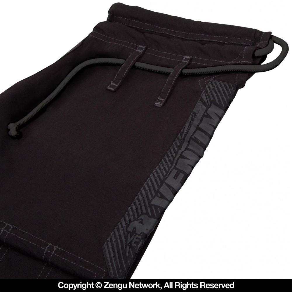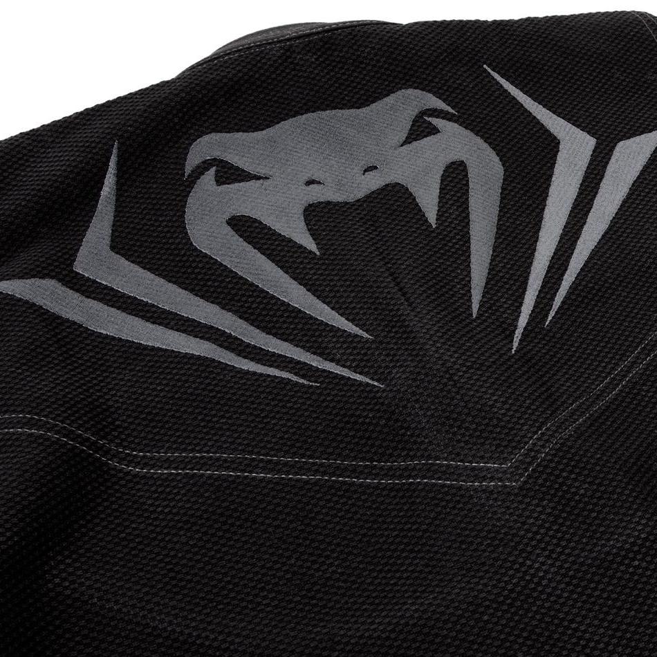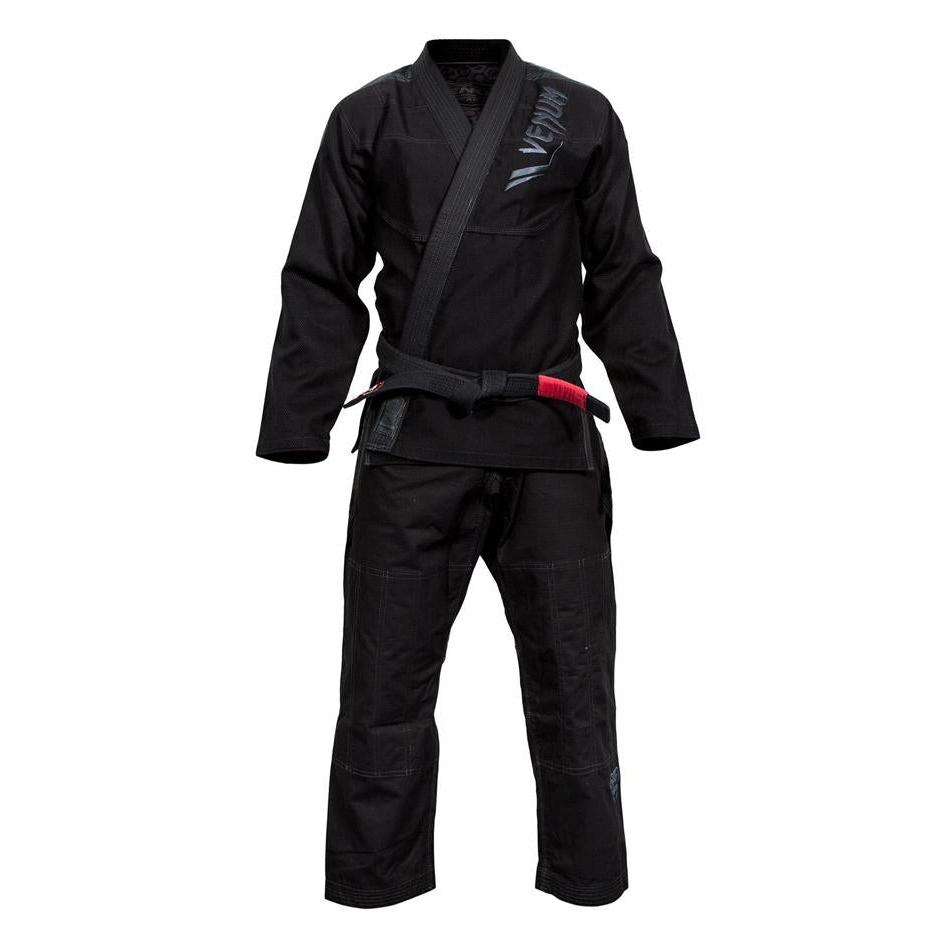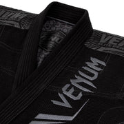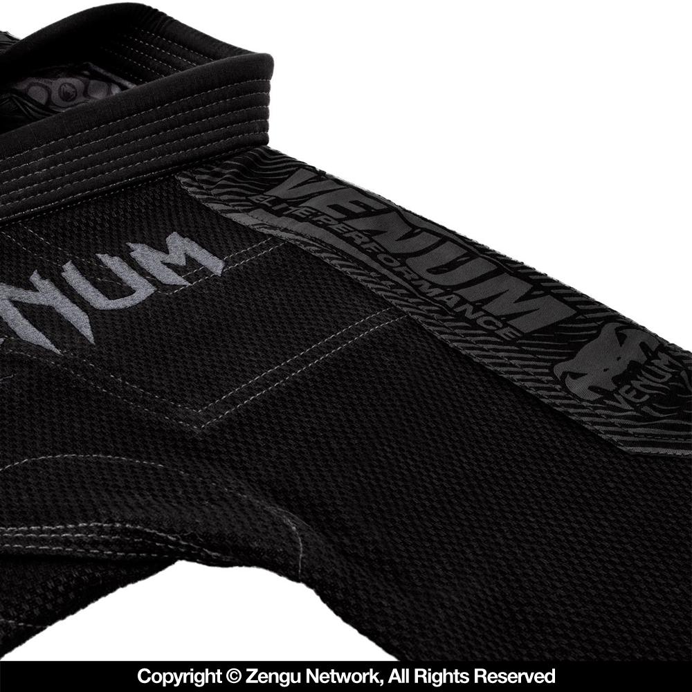 The new black on black edition of the Venum ELITE BJJ Gi! Main materials are pre-shrunk cotton: 500 GSM Gold Weave top and a lightweight ripstop pants.