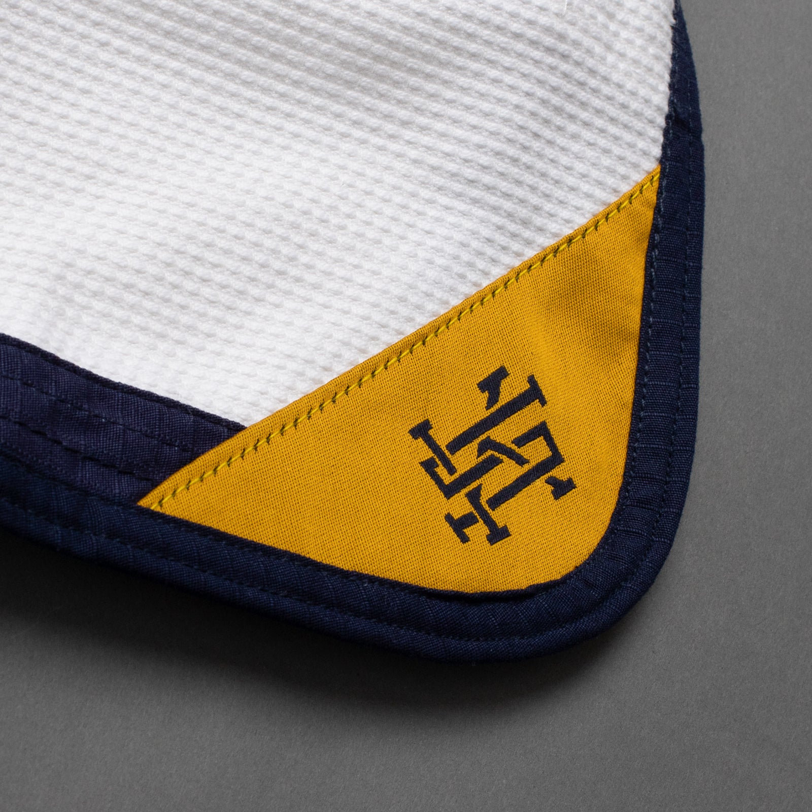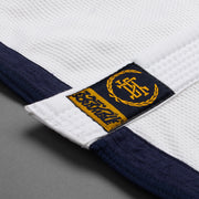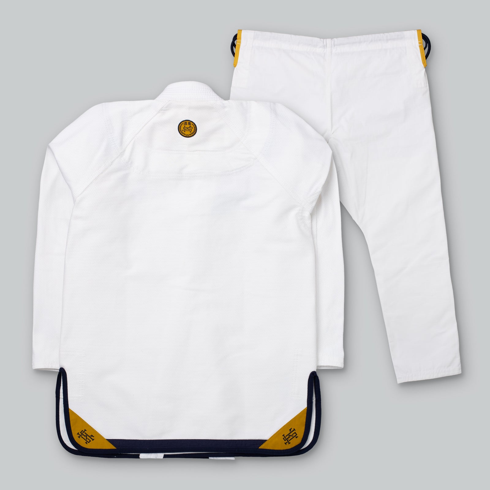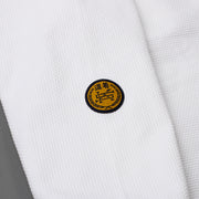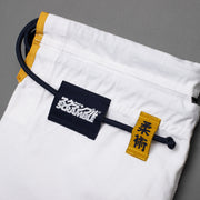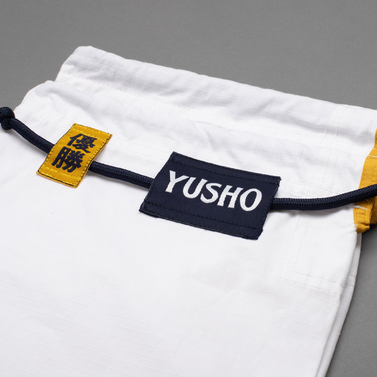 Scramble Yusho Gi pairs a sturdy 450 GSM pearl weave jacket with lightweight 10 oz ripstop pants. Embroidered Scramble branding spans across the shoulders, and gold accented patches are found on the rounded side vents. The pants showcase a custom Yusho emblem positioned on the back of the left leg, complemented by a wide belt loop embroidered with the Gi’s name. A breathable polymesh gi bag comes included for easy transport.