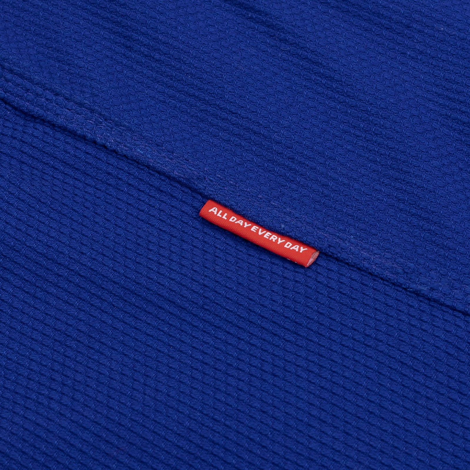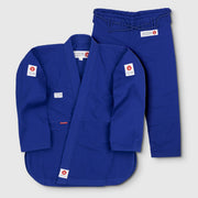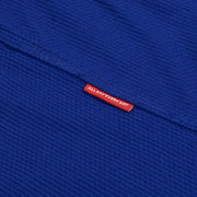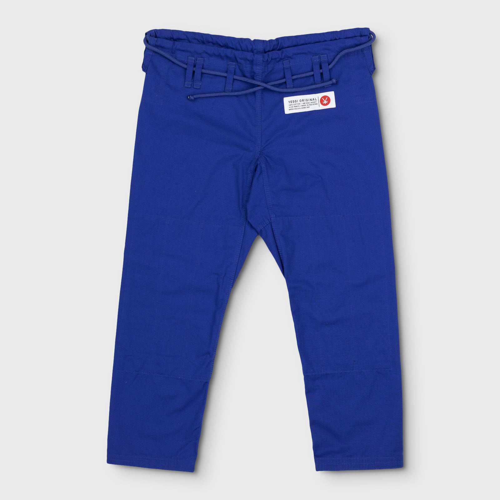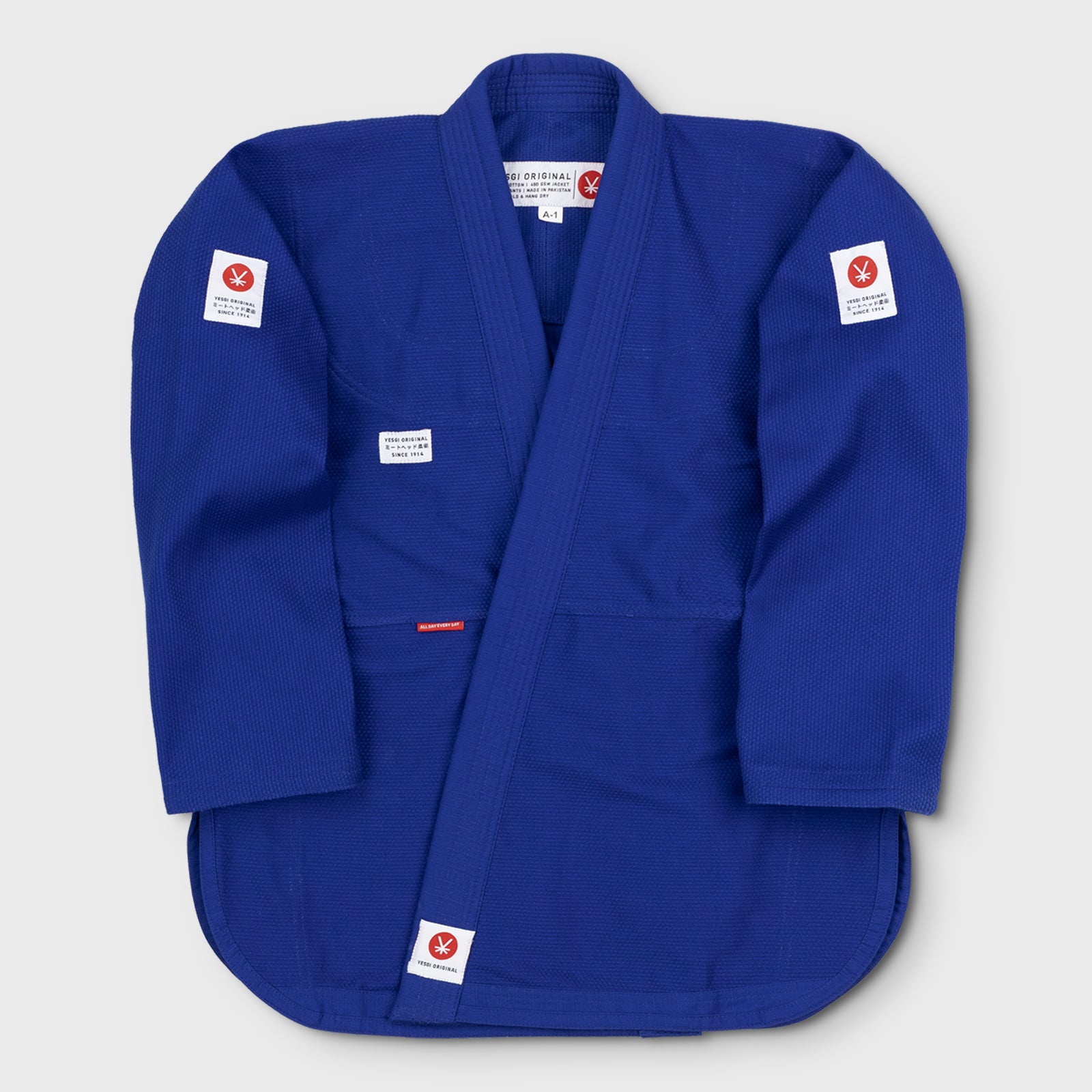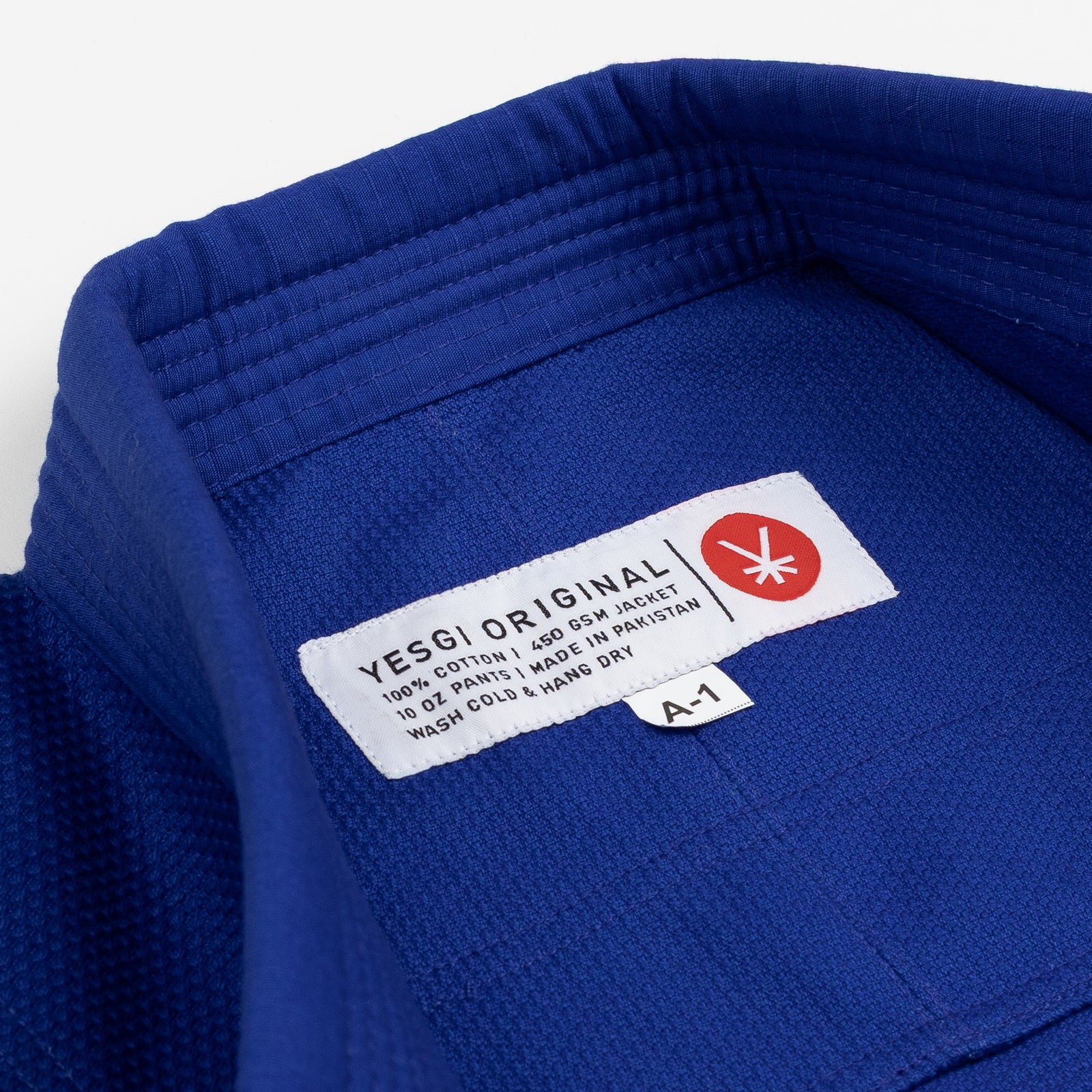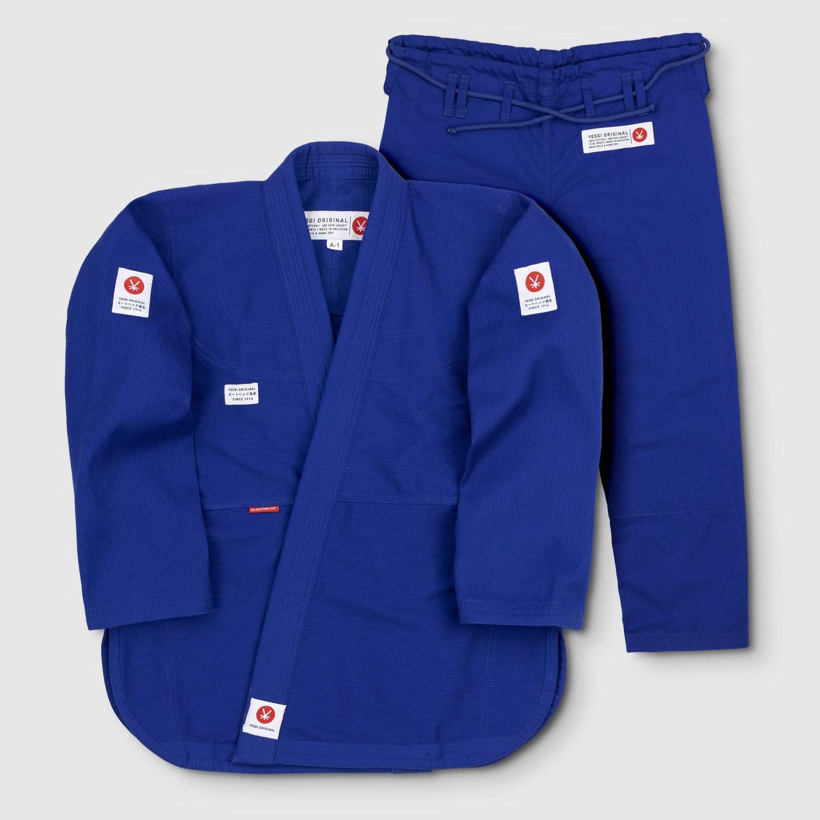 The blue Yesgi Original Kimono is a minimalist design with subtle branded patches and no contrasting stitching. It features a mid-weight 450 gsm top paired with 10 oz pants. The pearl weave jacket includes rounded vents and reinforced cuffs and hem, while the ripstop pants come with multiple drawstring loops and reinforced knees.
