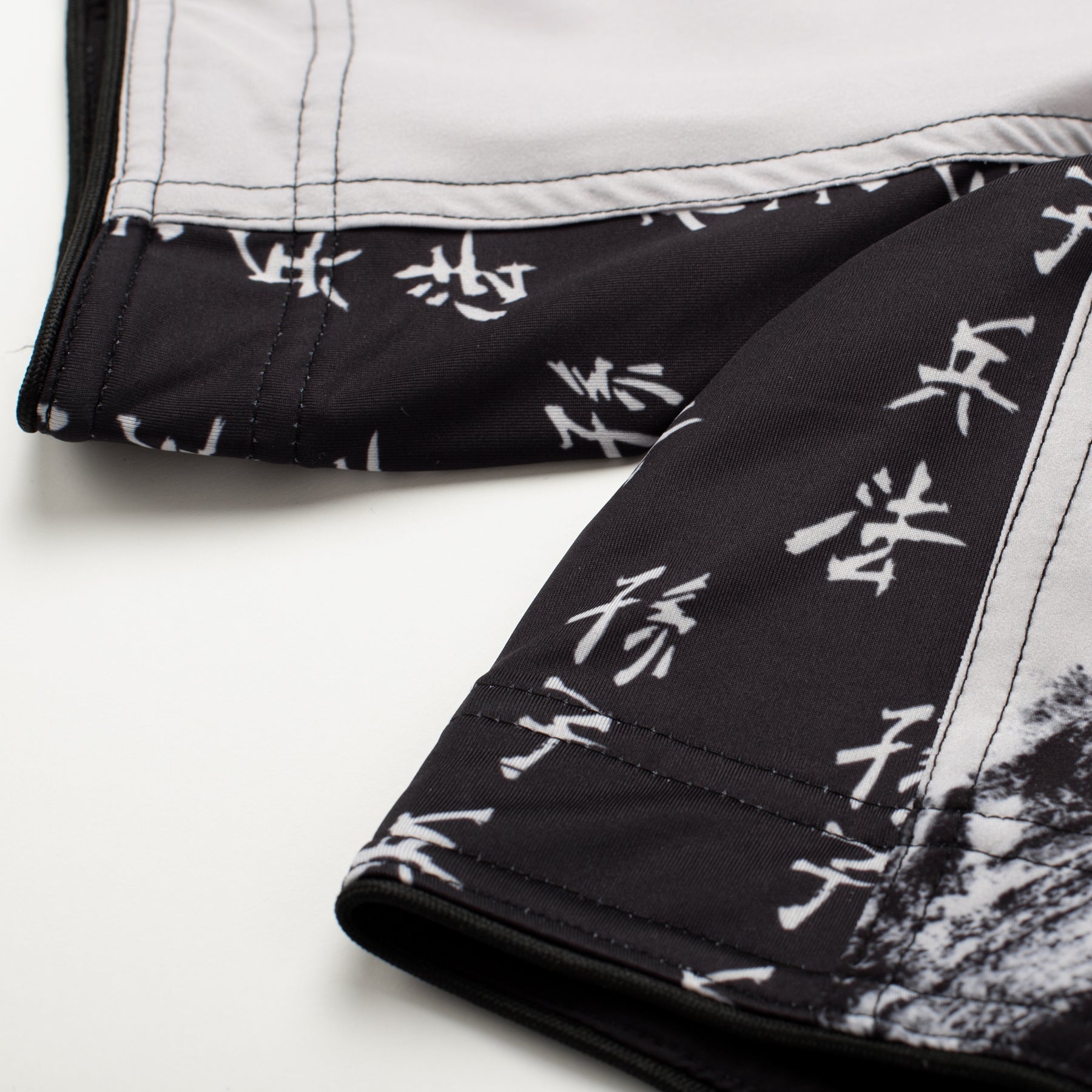 The overall design features an off-white base with bold graphics and branding that are fully sublimated into the material. The crotch gusset panel is made of a stretch fabric for added flexibility and sports a contrasting white repeating kanji design. Split side vents and lightweight materials contribute to the overall light and flexible feel.