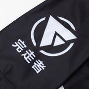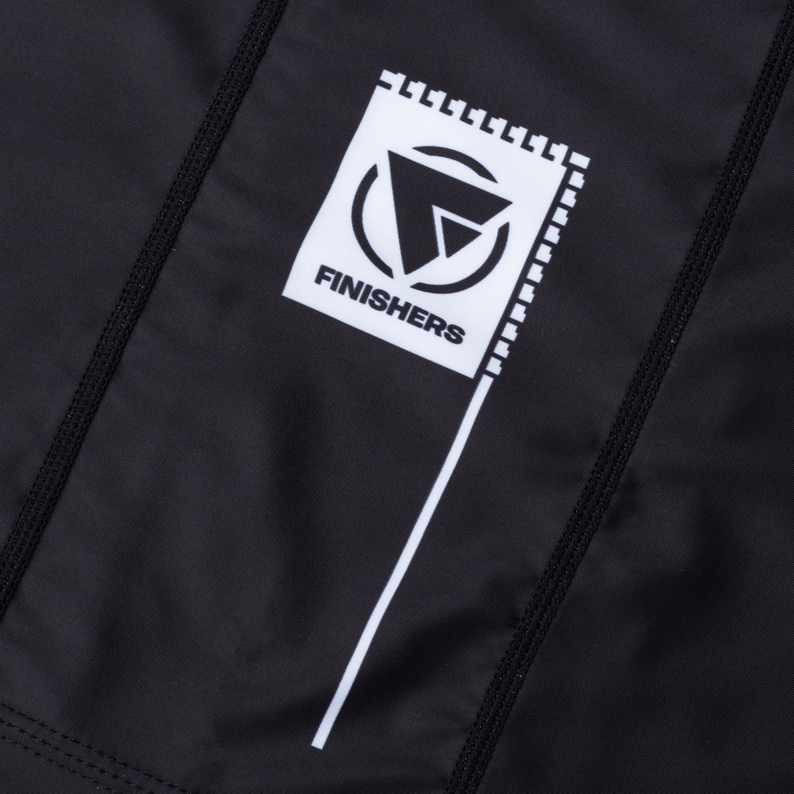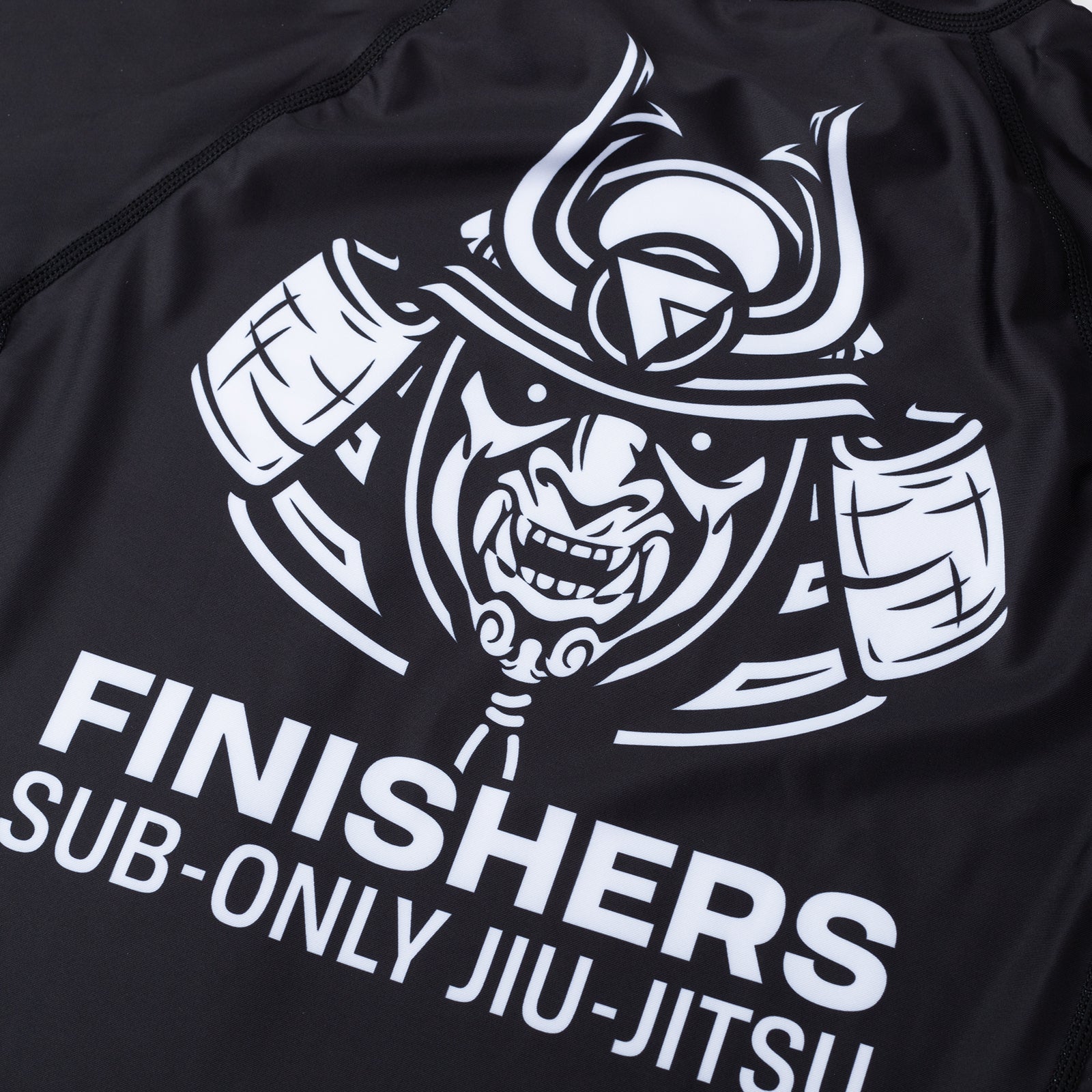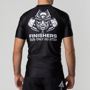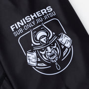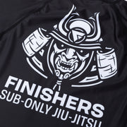 This Finishers rash guard features an eye-catching samurai design and their recognizable branding in a quiet two-tone color scheme. Constructed with a poly/Spandex blend. Lightweight, stretchy, and great for Nogi grappling.