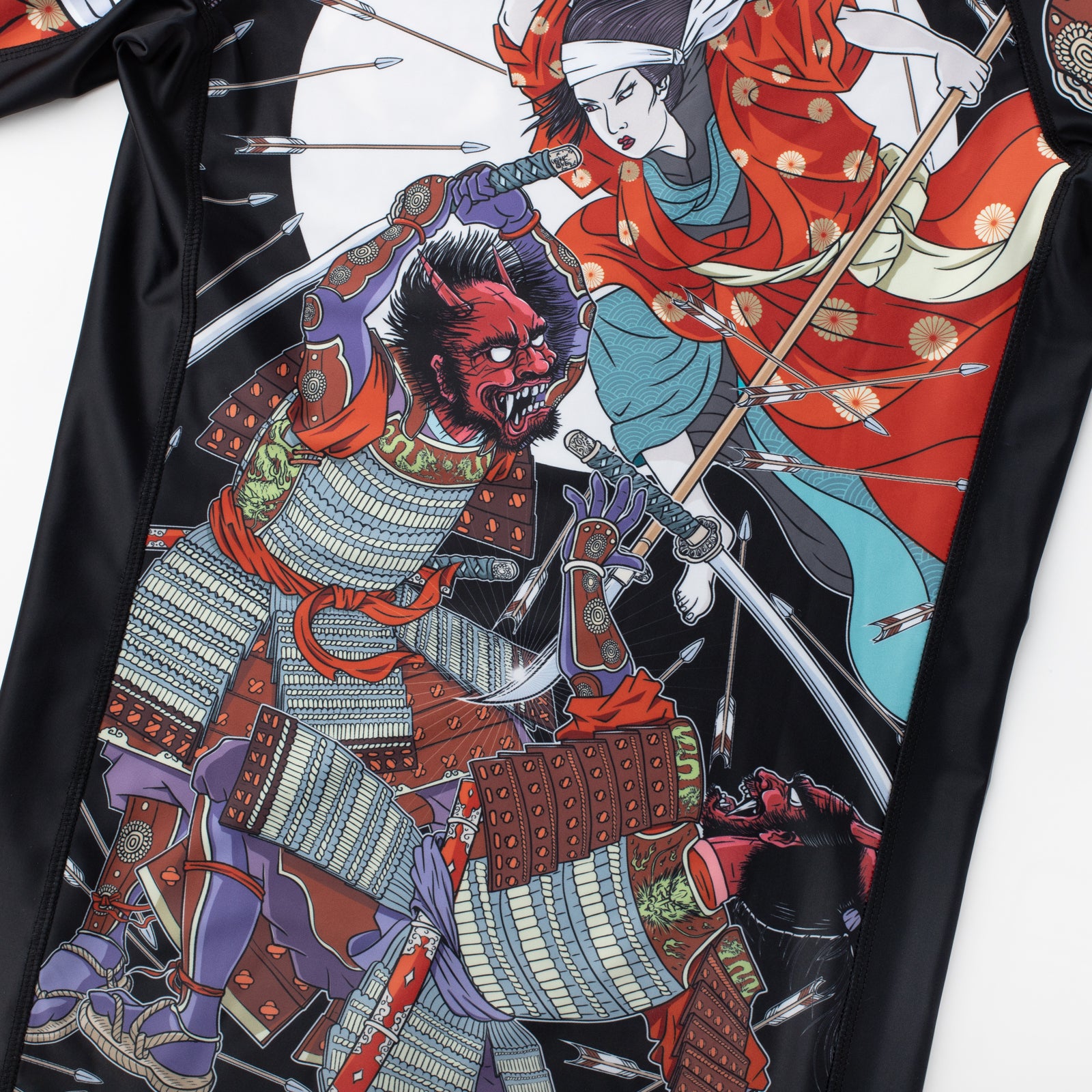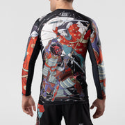 The "Demon Hunter" long sleeve rash guard features gorgeous sublimated artwork from Meerkatsu showcasing a fierce combat scene across the entire back panel. Constructed with a lightweight and breathable polyester/elastane material that's perfect for Nogi grappling.