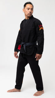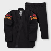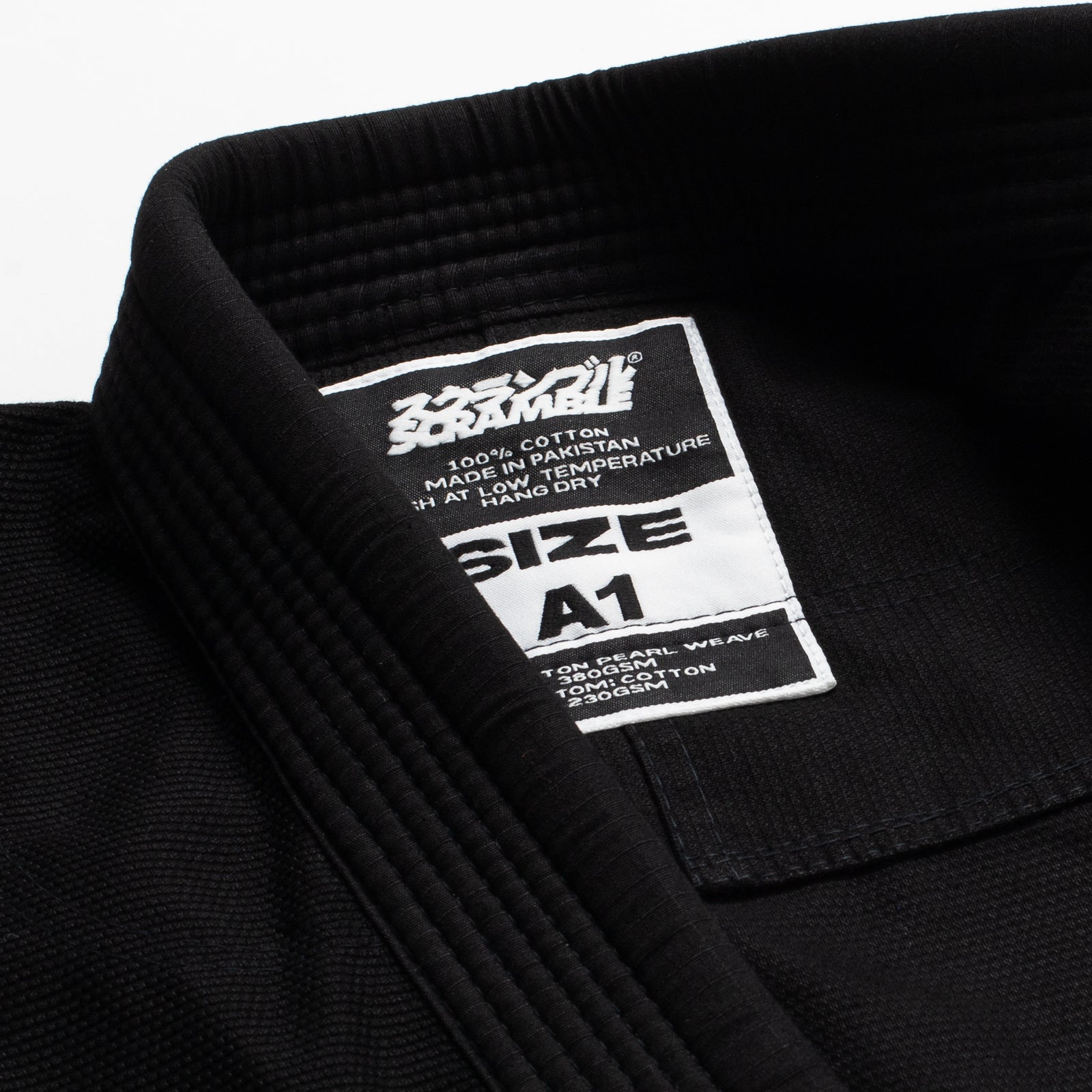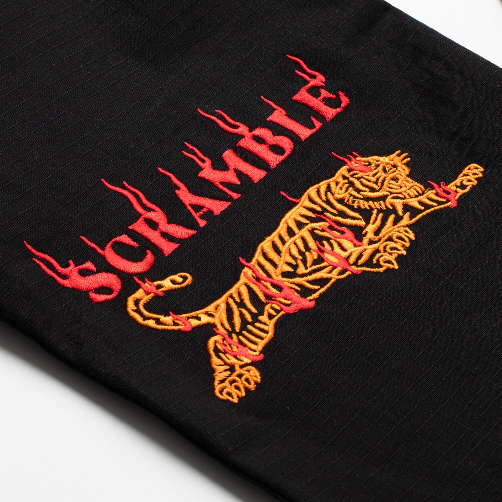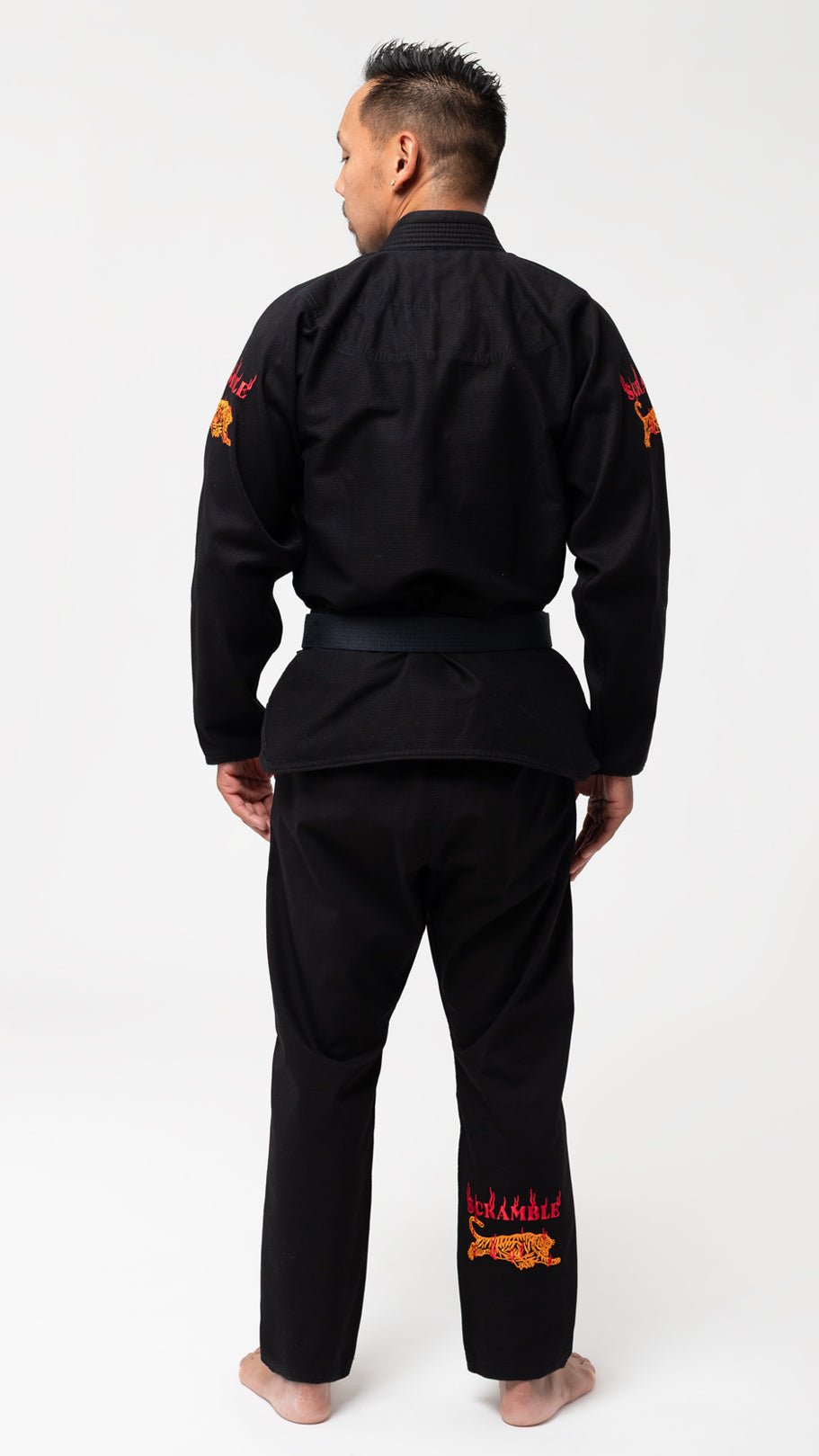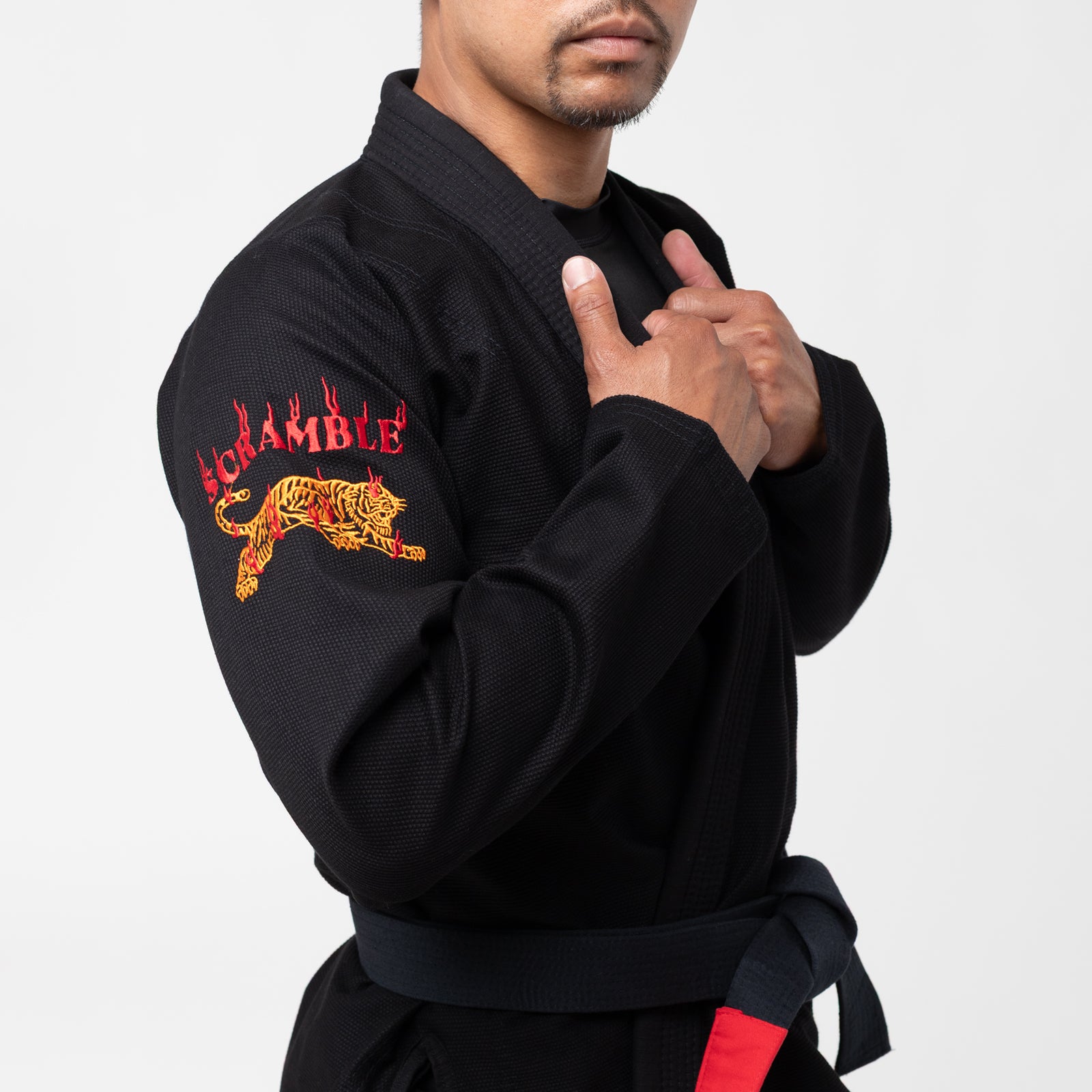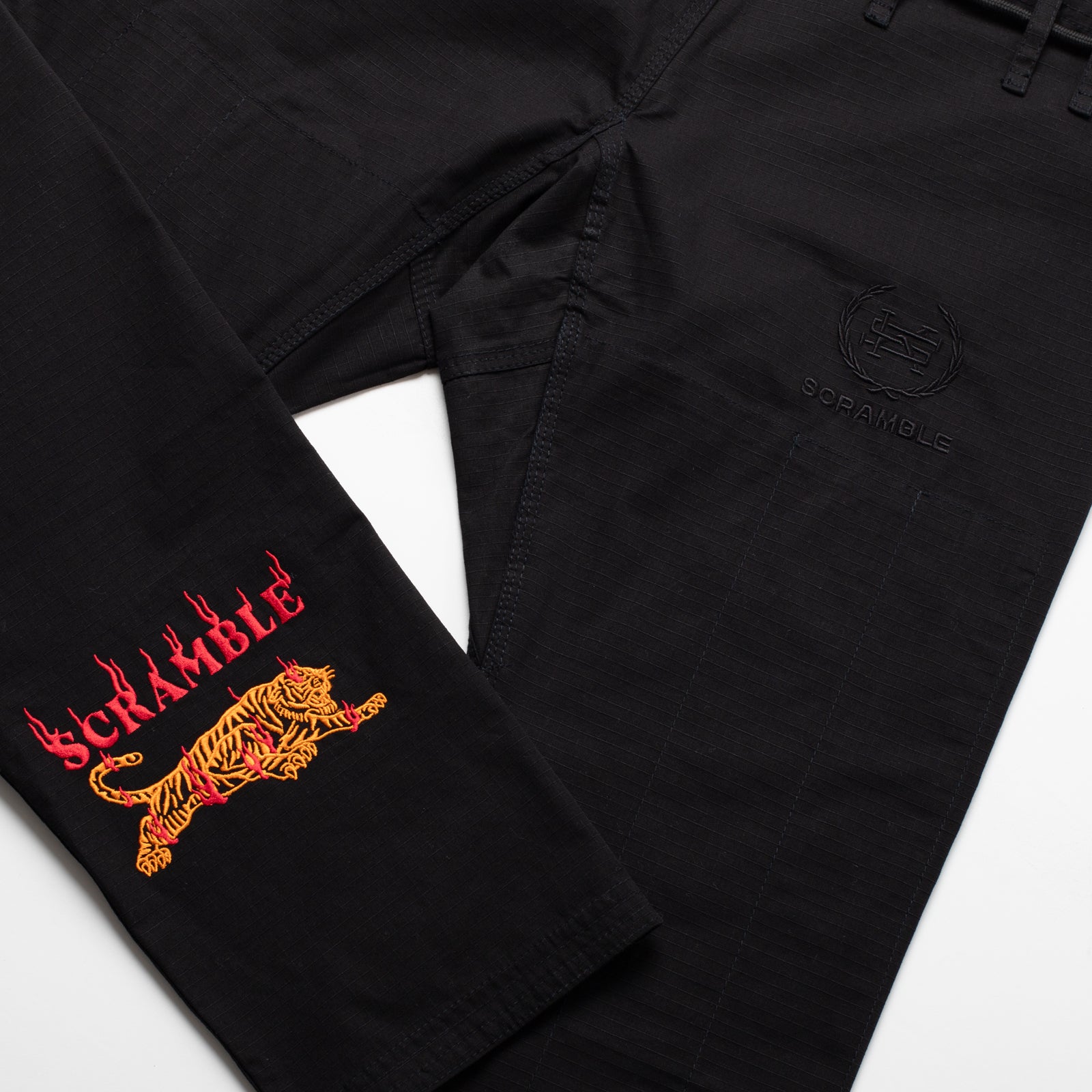 The Burning Tiger gi from Scramble features a sleek blacked-out base, accented by striking tiger embroideries that add a fierce edge. Classic Scramble branding—through signature patches and intricate detailing—runs seamlessly across the design, blending tradition with bold style.